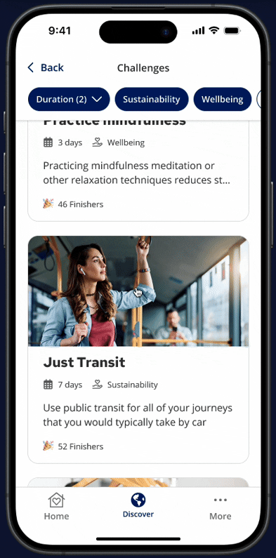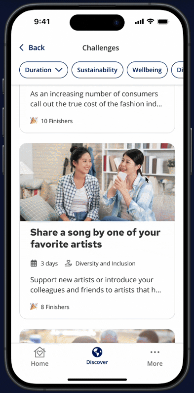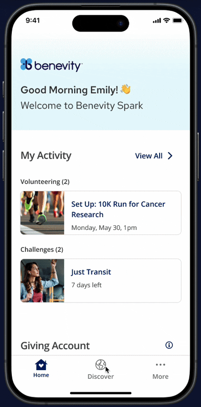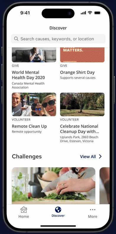 Find your next good deed in seconds! Scroll through a variety of high-impact opportunities on the Discover tab and tap into the dedicated Challenges area.