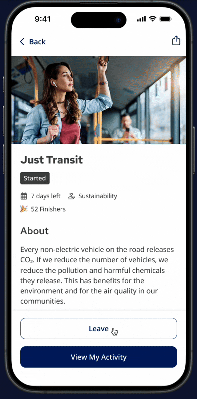 The "Leave" option is clearly presented on the challenge detail page, empowering the user to manage their commitments. It’s secondary to the "View My Activity" (or completion) button to prevent accidental taps, but easy to find.