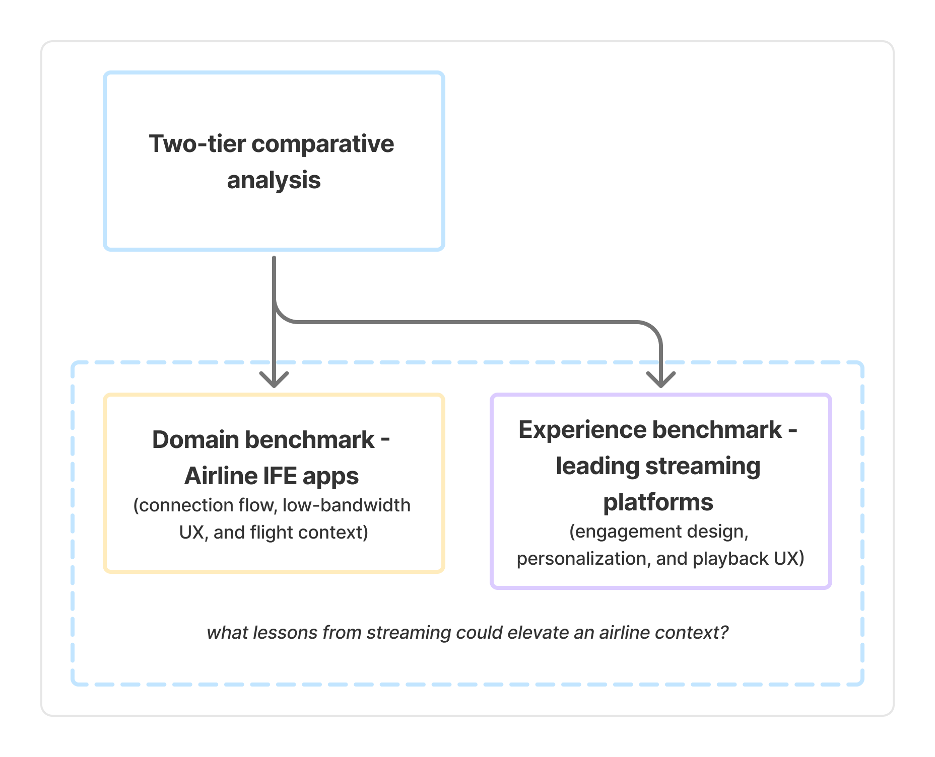 I looked horizontally at airline apps, but also vertically at best-in-class entertainment UX patterns from streaming leaders.